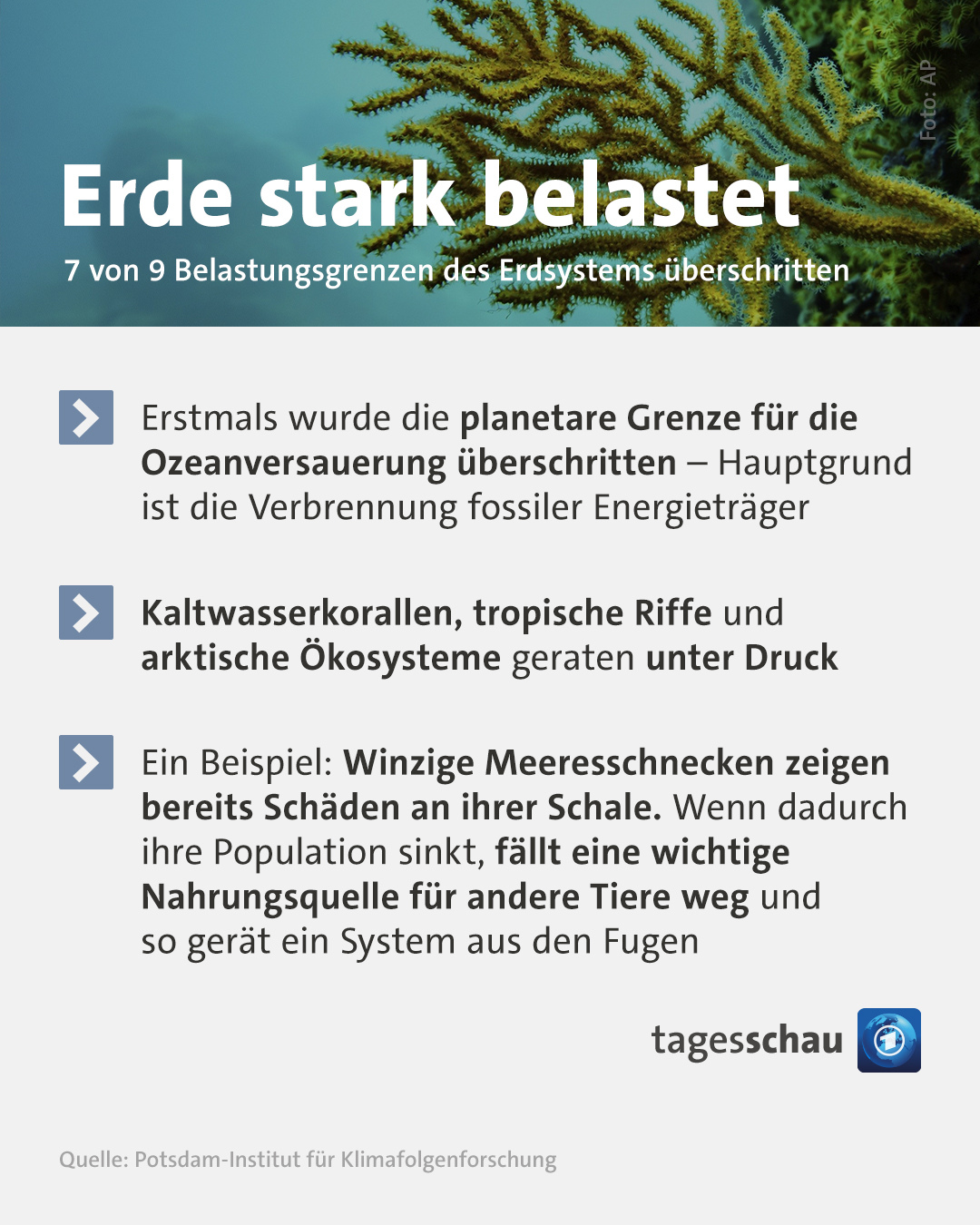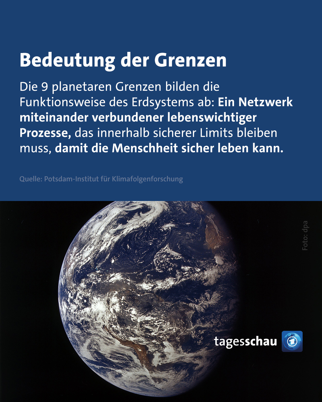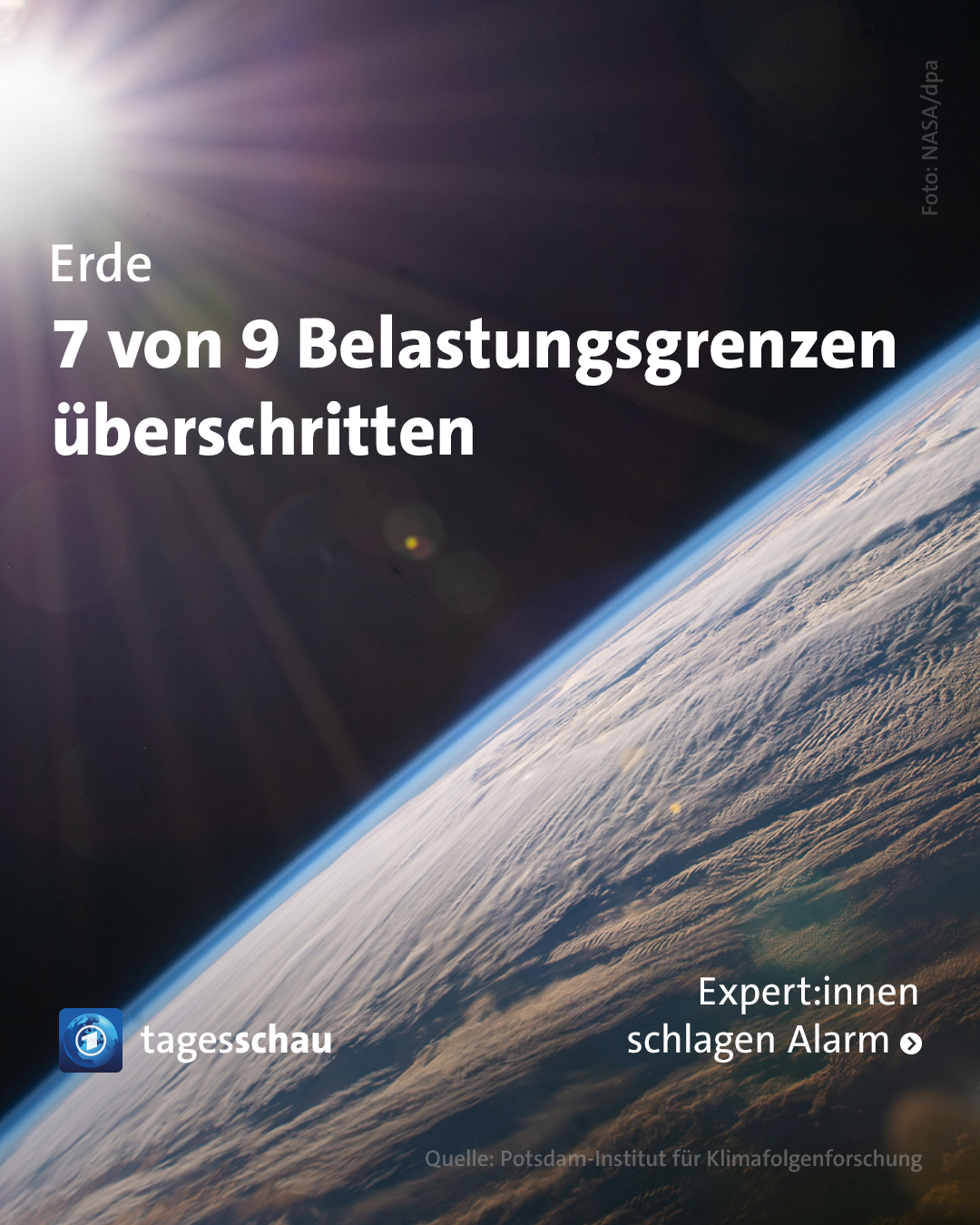 @tagesschau berichtet auf Instagram: „Die Mehrheit der lebenswichtigen Funktionen unseres Planeten ist nach einem neuen Bericht von Klimawissenschaftler:innen in Gefahr. Dem „Planetary Health Check“ des Potsdam-Instituts für Klimafolgenforschung (PIK) zufolge sind sieben von neun kritischen Belastungsgrenzen des Erdsystems überschritten – eine mehr als im Vorjahr.